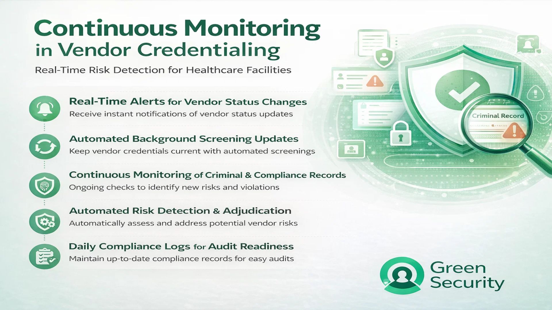To address these gaps, Green Security has launched Continuous Monitoring, the first solution designed specifically for healthcare vendor credentialing that provides real-time risk detection and automated compliance monitoring.