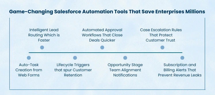 Organizations may free up staff members to concentrate on high-value, strategic tasks like lead nurturing, customer retention, and innovation by automating Salesforce procedures. Additionally, automation speeds up decision-making, decreases errors, and enhances compliance—all of which have real financial advantages.