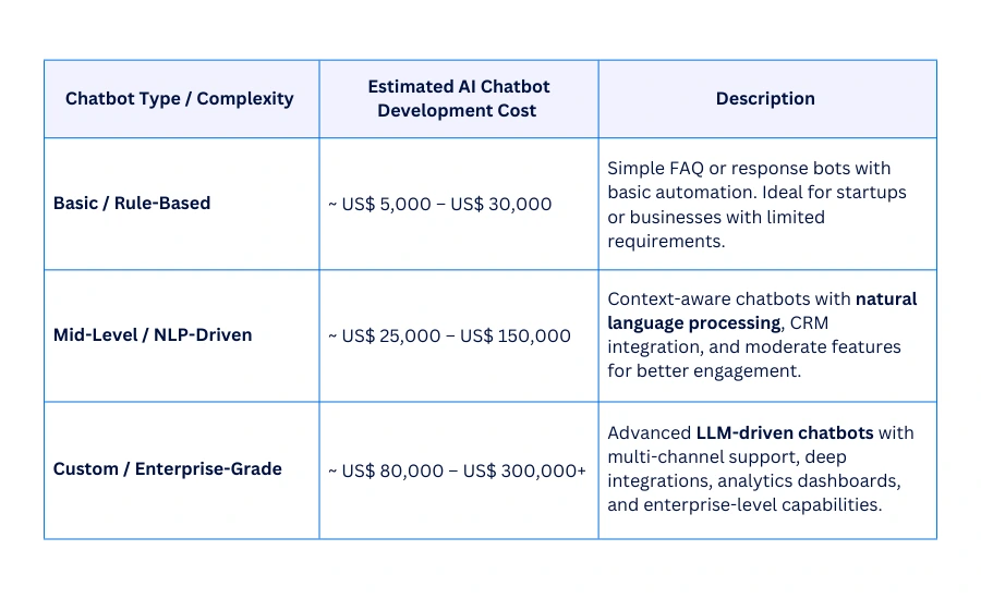 Basic rule-based chatbots cost much less than intelligent AI-driven conversational bots. Enterprise-grade or LLM-powered chatbots sit at the higher end.
